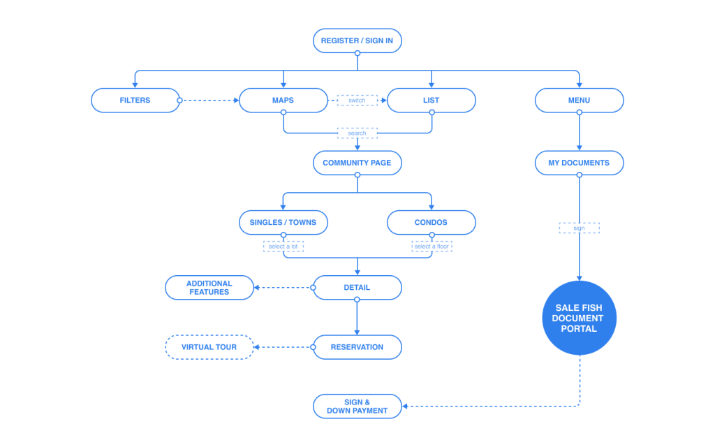 The information architecture not only aims to let users focus on home searching but also to showcase more about the community to give them more flexibility to find their dream home. Therefore, we designed the user flow as Search → Community → Home