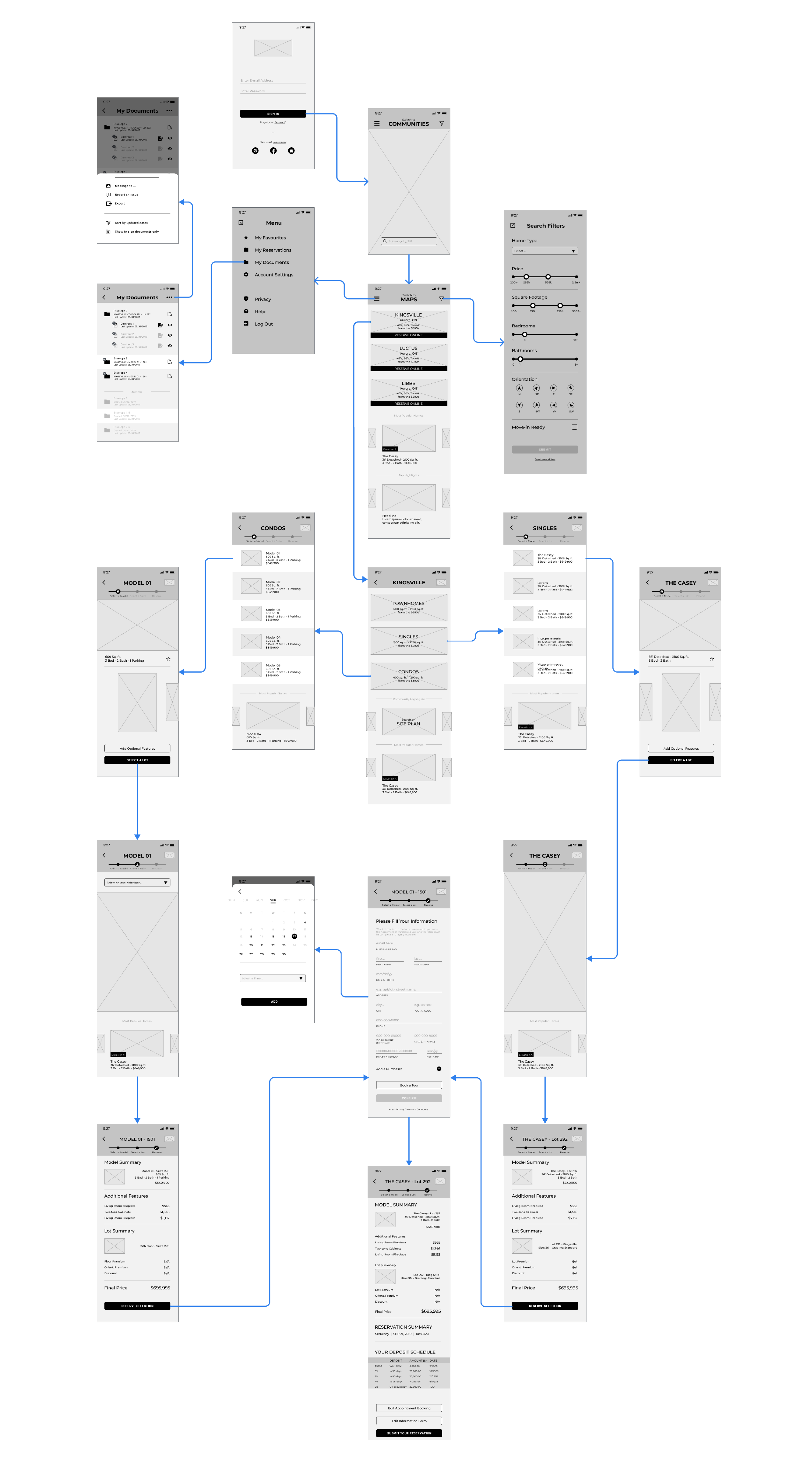 1. Home List | 2. Home Map | 3. Log-in | 4. Search Filter | 5. My documents | 6. Model | 7. Select a Lot | 8. Model Page | 9. Check Out | 10. Fill Information | 11. Reservation