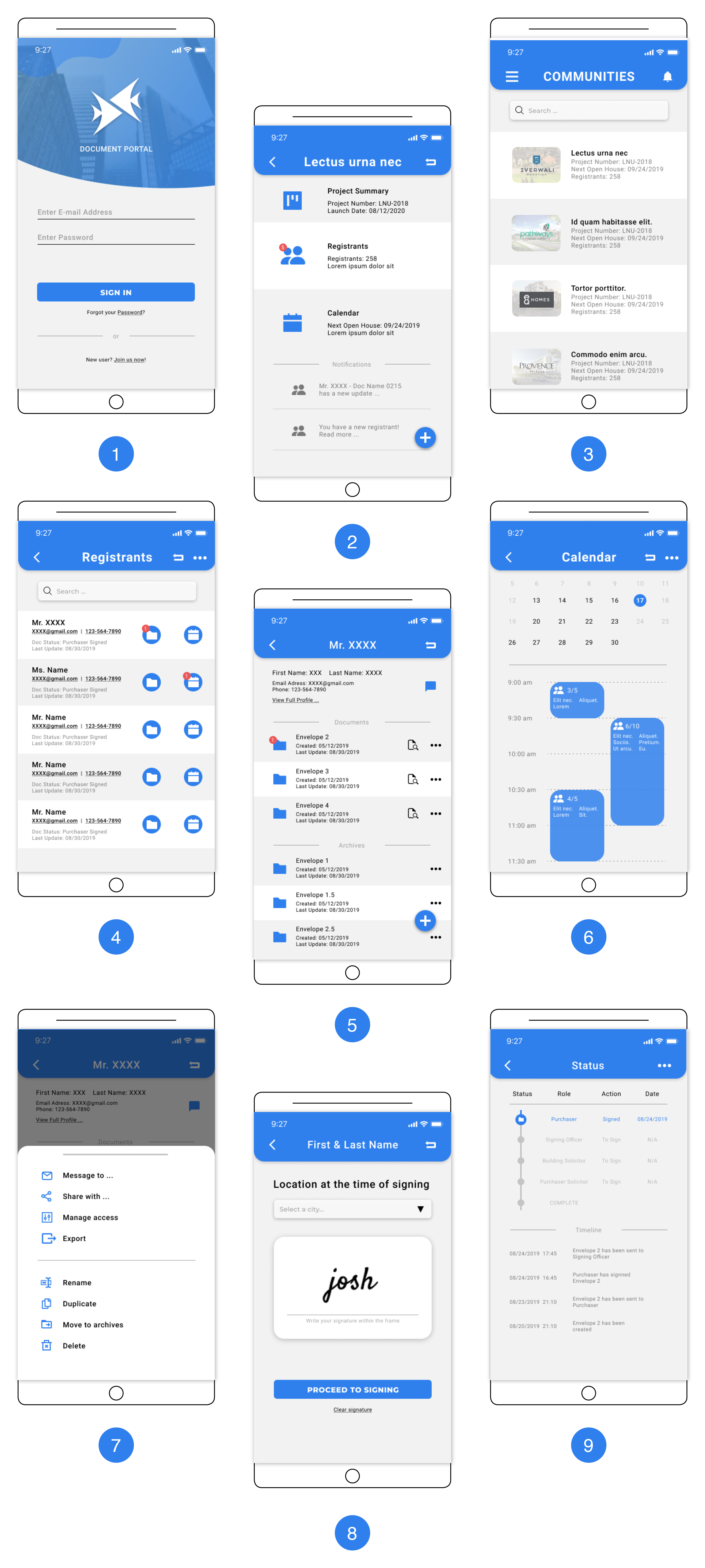 1. Log-in | 2. Community Page | 3. Home Page | 4. Registrants List | 5. Individual Page | 6. Calendar | 7. Individual Page-Edit Action | 8. Signing | 9. Signing Status