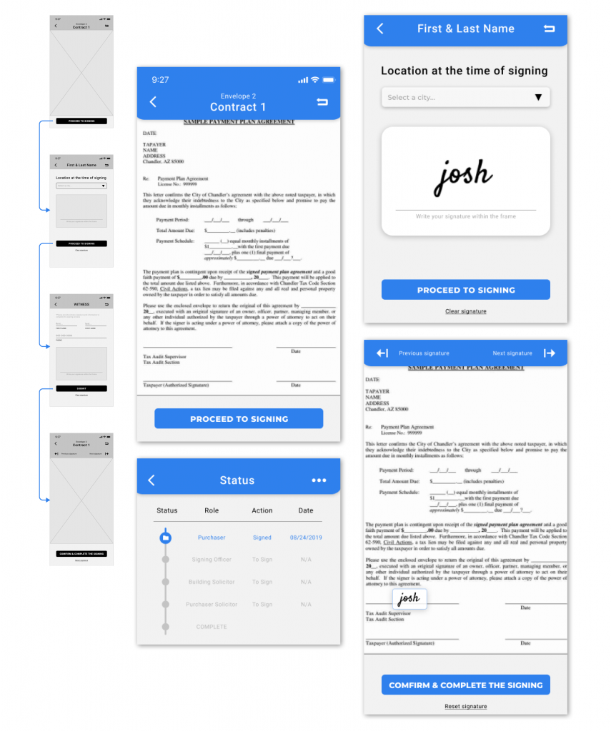 The flow: select home → create legal documents → user to sign → signing officers to sign → lawyers to sign → complete. All will be done in one app.